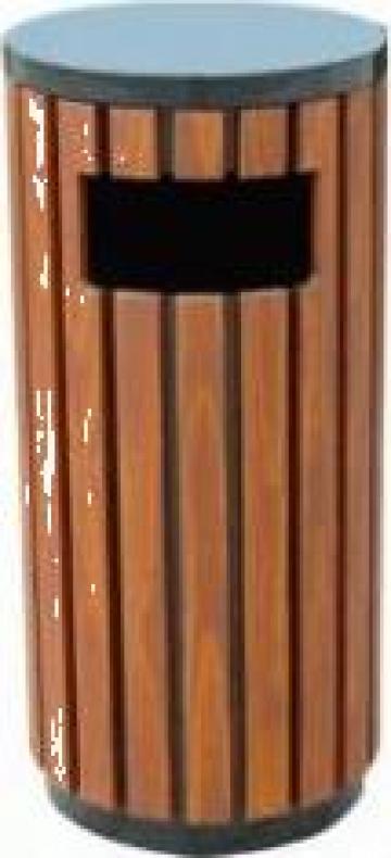 Cos de gunoi stradal din otel, forma rotunda, cu o constructie solida lacuita cu vopsea pulbere de calitate superioara. La interior este prevazut cu o captuseala metalica pentru colectarea si strangerea deseurilor. Capacul metalic se poate scoate pentru indepartarea deseurilor colectate. Partea exterioara a cosului este alcatuita din profile otel cu imitatie de lemn de calitate.